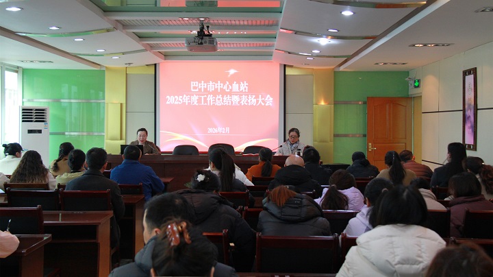 2026年2月12日,巴中市中心血站召开2025年度工作总结暨表扬大会,站领导班子、全体干部职工齐聚一堂,总结“十四五”期间取得的成绩,擘画2026年采供血事业发展新蓝图。会议由副站长何佳玲主持。