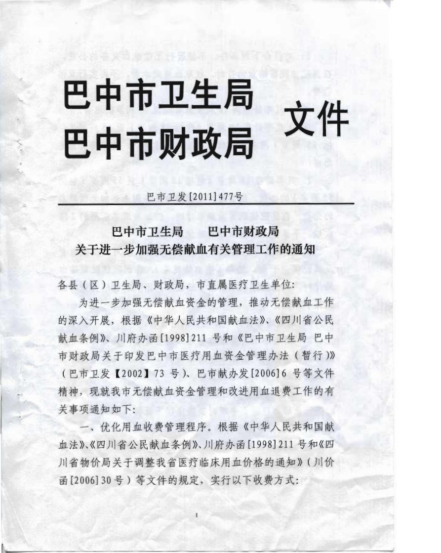 巴中市关于进一步加强无偿献血有关管理工作的通知